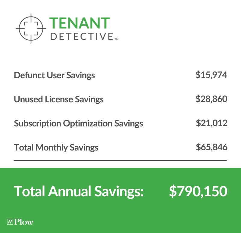 To uncover the full scope of the problem, the organization partnered with Plow Networks to deploy TenantDetectiveTM, a specialized tool designed by our team to analyze licensing structures. We conducted a comprehensive audit that evaluated user activity, license assignments, and subscription utilization. Our team discovered a 27% potential cost reduction, amounting to nearly $800,000 in annual savings.